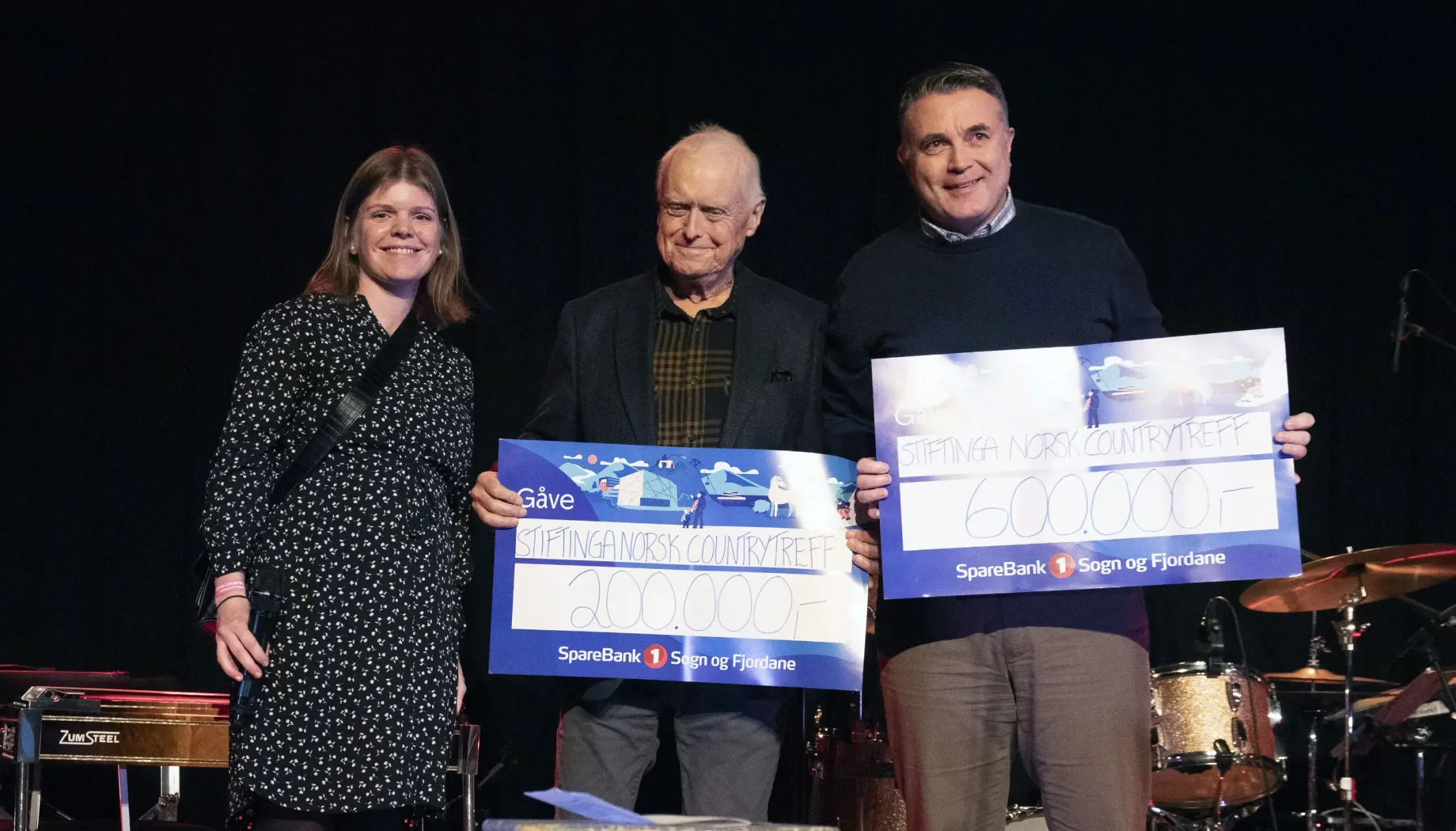 Helene Gåsemyr frå Sparebank1 Sogn og Fjordane, styreleiar i Stiftinga Norsk Countrytreff Nils R. Sandal og dagleg leiar Vegar Sårheim med gåvesjekkane.